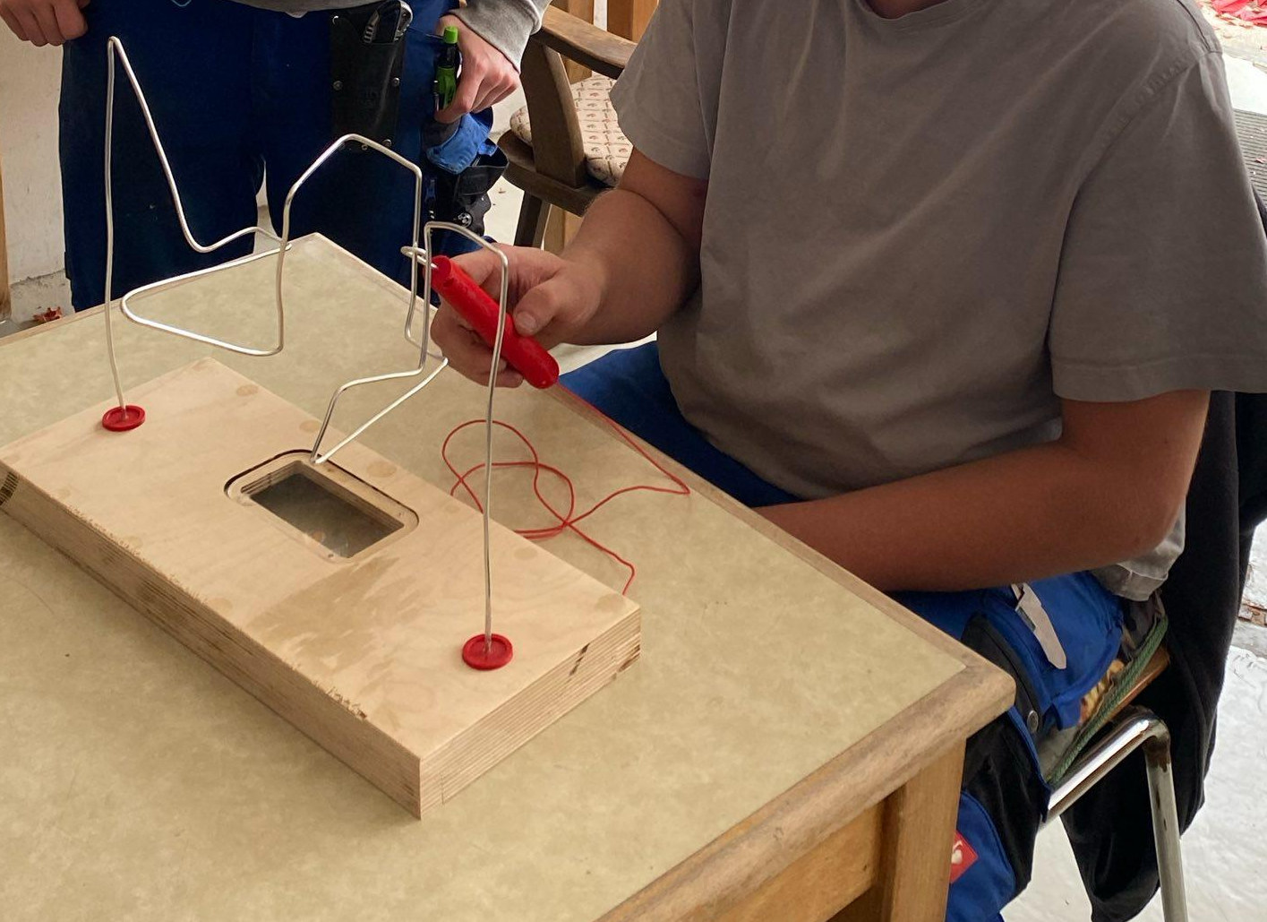 Mittels eines in OpenSCAD entwickelten „Drahtdesigner“ konnte der Drahtweg am Computer entwickelt und gleich angezeigt werden. So konnten die zwei gebildeten Teams ihr Spiel designen. Anschließend musste die benötigte Drahtlänge grob berechnet werden und dann einigermaßen entsprechend dem selbst entwickelten Design gebogen werden. Der Draht wurde dann auf dem vorgefertigten Brett befestigt und mit der Elektronik (Batterie und Summer) verbunden. Ein erstes Ausprobieren des Spiels zeigte, wie schwierig der selbst entworfene Drahtweg zu meistern war … und schon waren die beiden Stunden wie im Flug vorbei.