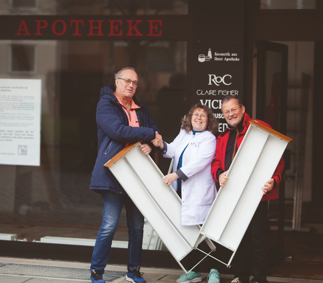 Apotheken-Inhaberin Ulrike Sommer, die in Zorneding auch die Adler-Apotheke betreibt, war sofort begeistert, als der Makerspace-Vorstand mit der Idee auf sie zukam. So freut sie sich über die unkomplizierte Räumung der Ladenfläche am Herzogplatz, vor allem aber darüber, dass die Möbel ein zweites Leben bekommen.