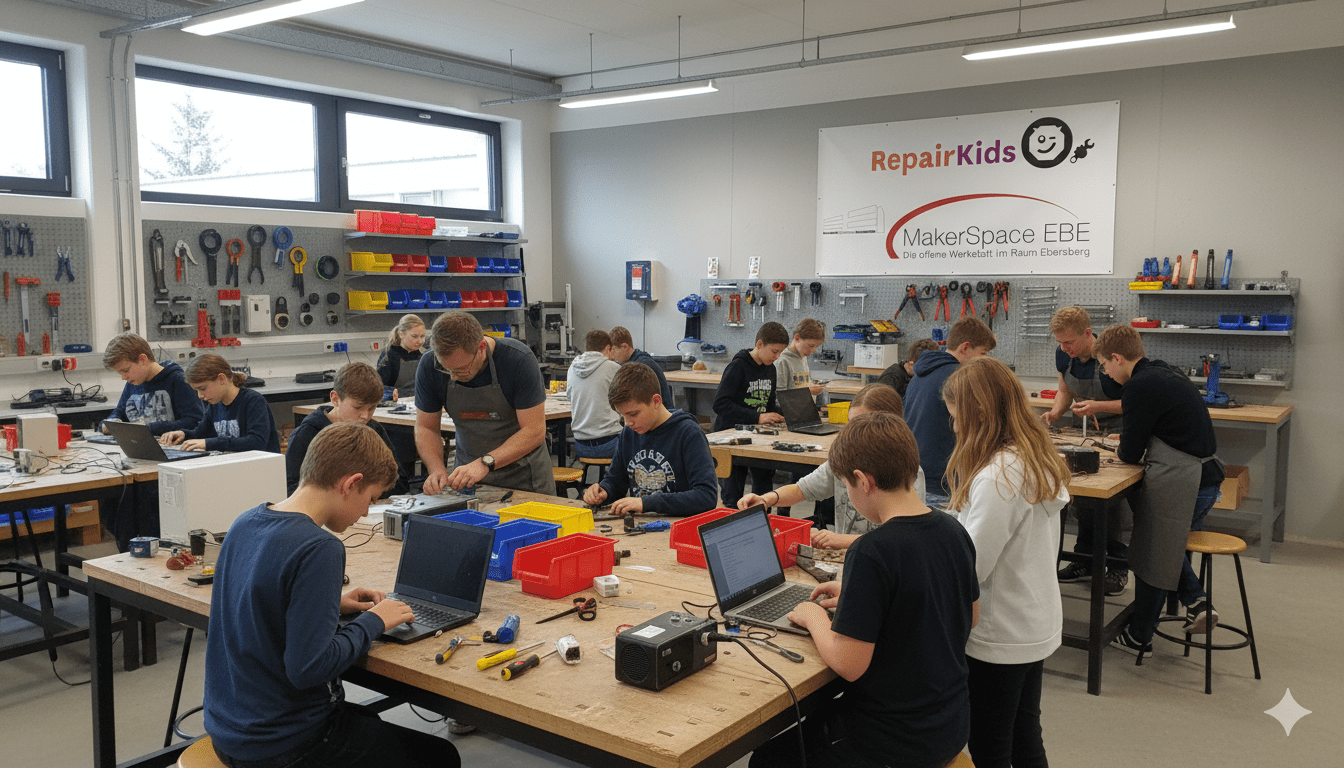 Auch in diesem Schuljahr werden wir wieder RepairKids-Aktionen an Schulen in unserer Umgebung veranstalten. In diesen Veransteltungen dürfen Schüler selbst Geräte zur Reparatur mitbringen und mit unserer Hilfe versuchen, diese zu reparieren. Wir vom MakerSpace sind in den meisten Fällen also nur Zuschauer, Ratgeber und Helfer – und die Schüler lernen so, das reparieren Spaß machen kann und wie groß die Freude ist, wenn das Gerät wieder funktioniert. Und zum Abschluss gibt es auch noch eine Urkunde. (Das Beitragsbild ist aus Personenschutzgründen KI-generiert)