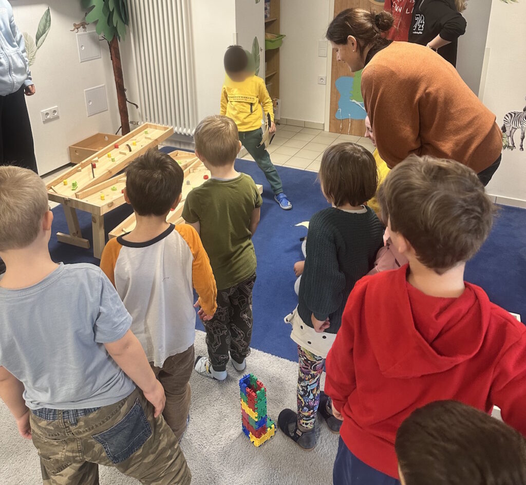 Mit erwartungsvollen Augen haben die kleinen Kinder den Aufbau der Murmelbahn verfolgt und darauf gewartet, damit zu spielen. Schnell haben die Jugendlichen des BBW die Bahn aufgestellt und die Kugeln an die kleinen Kinder verteilt. Und es hat dann Spaß gemacht zu sehen, wie schnell die kleinen Zwerge sich des Spielzeugs bemächtigt haben – da haben auch die Workshopteilnehmer und wir vom MakerSpace glänzende Augen bekommen.